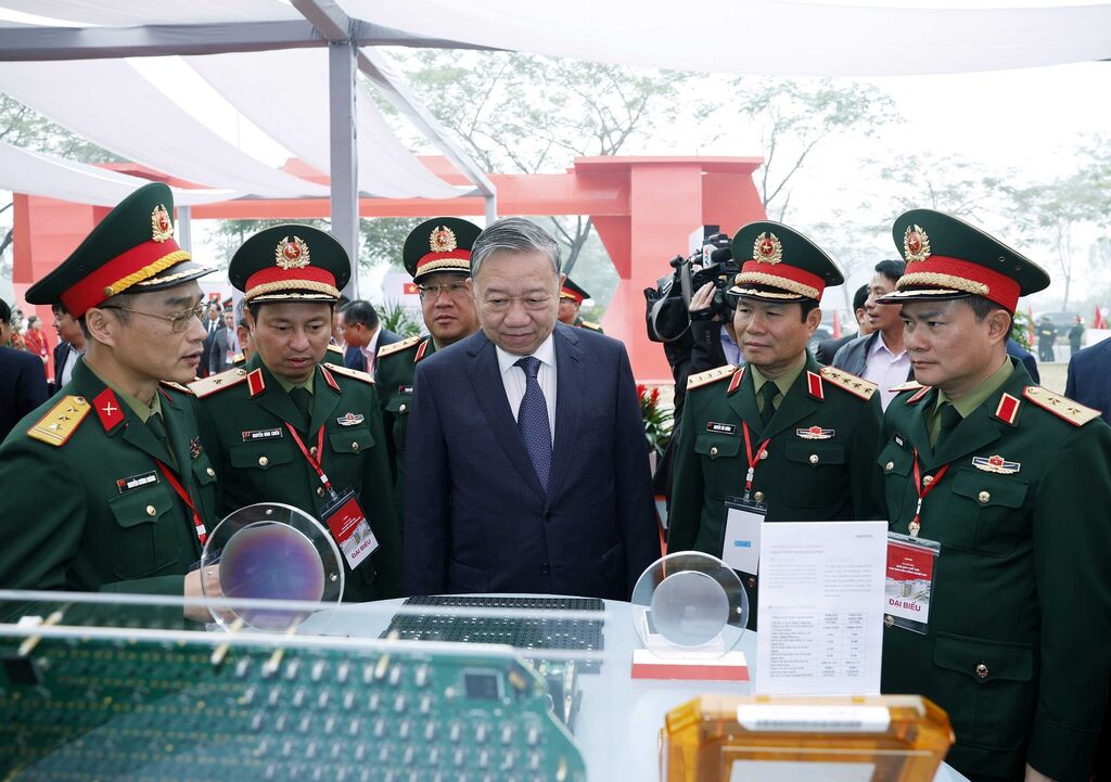 | Le secrétaire général Tô Lâm (centre) et des délégués visitant le stand d'exposition lors de la cérémonie d'inauguration de l'usine de fabrication de puces semi-conductrices de haute technologie, le 16 janvier. |