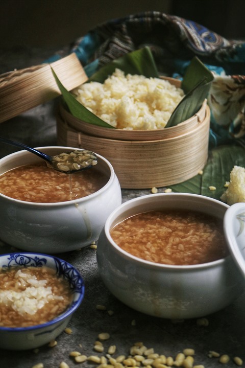 Il est confectionné à partir de riz gluant et de haricot mungo et se déguste avec du chè bà côt (sirop de palme sucré).