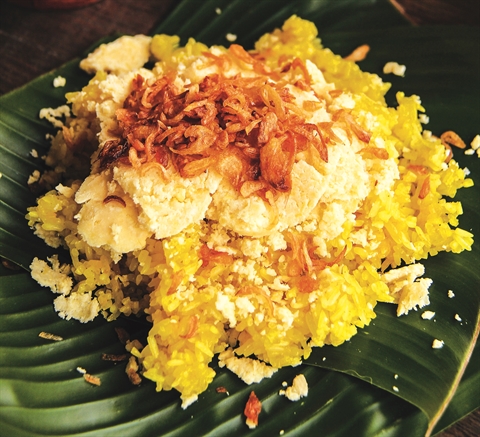 - Mettre le riz gluant dans une assiette. Disposer une couche de haricot haché et parsemer d’échalotes frites. Servir chaud avec du porc effiloché.