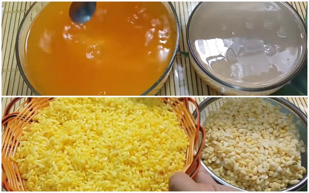 Les haricots mungo trempent d’abord dans l'eau pendant deux heures, puis sont cuit à la vapeur pendant environ 40 minutes. Une fois cuits à la vapeur, les haricots sont écrasés ou moulus en une pâte lisse et façonnés en toutes petites boules qui sont ensuite tranchées en diagonale et déposées sur le riz gluant.