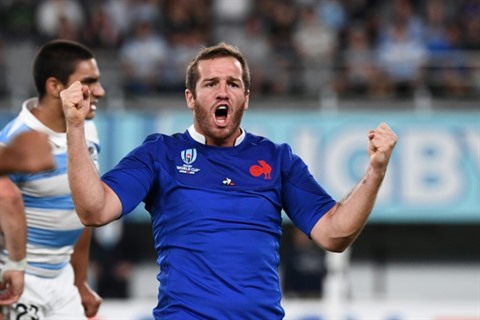 | Le demi d'ouverture Camille Lopez exulte après la victoire du XV de France face à l'Argentine au Mondial, le 21 septembre à Tokyo. |