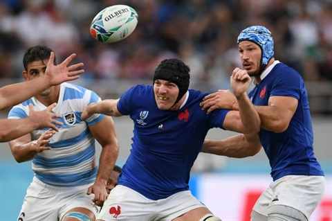 | Le 2e ligne du XV de France Arthur Iturria (centre) lors du match contre l'Argentine au Mondial, le 21 septembre à Tokyo. |