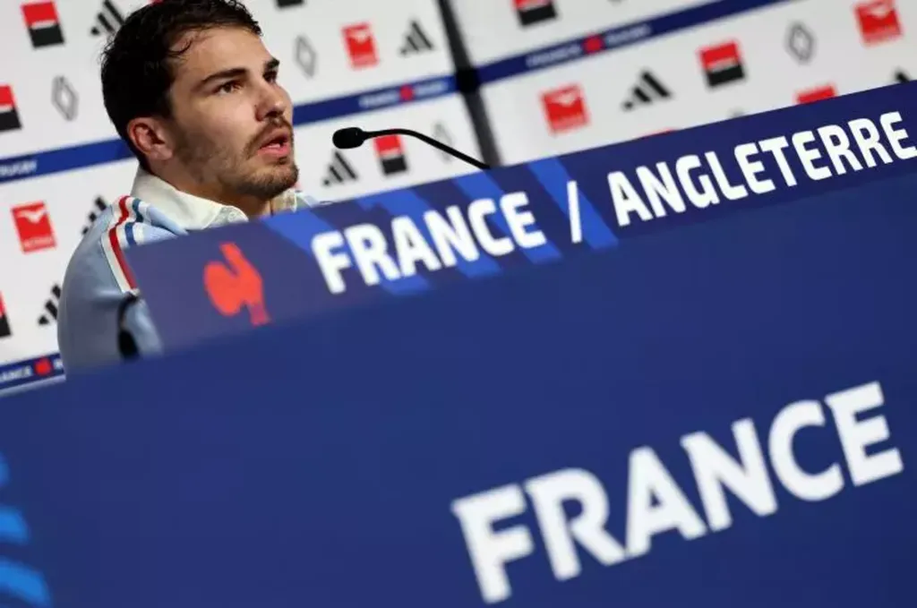 | Antoine Dupont en conférence de presse le 13 mars 2026 au Stade de France, à la veille de France-Angleterre. |
