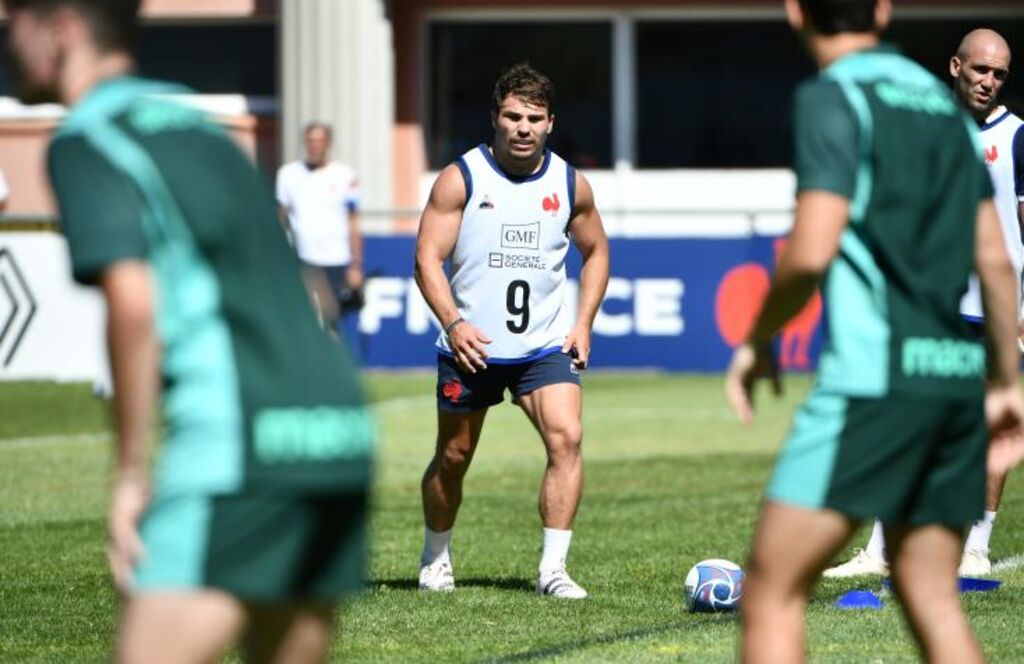 | Le demi de mêlée Antoine Dupont et les joueurs de l'équipe de France de rugby à l'entraînement le 8 août. |