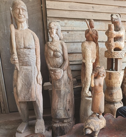 Entouré de centaines de figurines en bois, Y Thai Êban commence la conversation en présentant quelques-unes de ses œuvres dont Le chaman. "C’est une de celles que je préfère le plus. Elle s’est vu décerner la médaille d’argent du Concours de sculpture sur bois des ethnies du Tây Nguyên (hauts plateaux du Centre) en 2017".