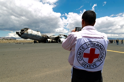 | Un membre de la Croix-Rouge sur le tarmac de l'aéroport de Sanaa, le 5 mai |