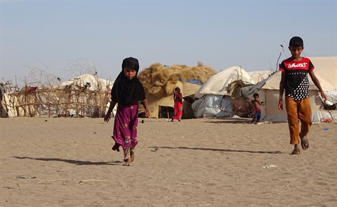 | Des enfants passent devant des tentes dans un camp de déplacés à Khokha, dans la province occidentale de Hodeida, le 6 mai 2020. |