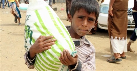| Photo d'un enfant ayant fui Hodeida et recevant de l'aide alimentaire à Abs, au Yémen, le 15 août. |