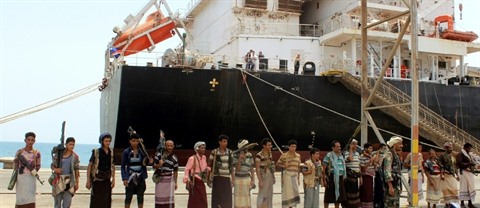 | Des opposants Houthis attendent avant de se retirer du port de Salif au Yémen, le 11 mai. |