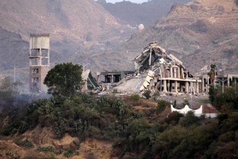 | Le palais présidentiel détruit par des raids le 17 avril 2015 à Taez. |