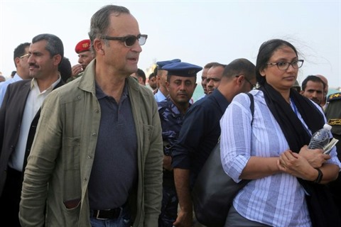 | Le chef des observateurs de l'ONU, le général à la retraite Patrick Cammaert (gauche), en visite au port de Hodeida, au Yémen. |