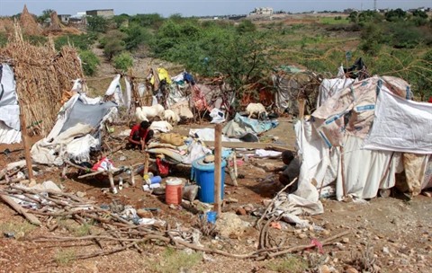 | Des Yéménites reconstruisent leur tente après des pluies torrentielles dans la province de Hajjah, dans le Nord du Yémen, le 19 avril. |