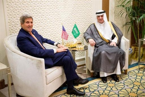 | Le secrétaire d'État américain John Kerry (gauche) et le chef de la diplomatie saoudienne Adel al-Jubeir, le 7 mai à Ryad. |