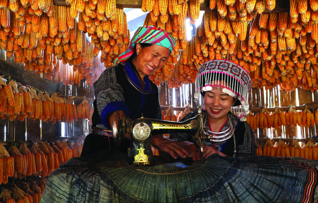 | La femme de Giàng A Súa (droite) apprend une touriste à utiliser la machine à coudre. |