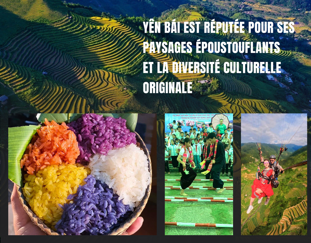 Yên Bái est réputée pour ses paysages époustouflants, son climat agréable toute l’année et la diversité culturelle de ses minorités ethniques. La province compte 574 patrimoines culturels immatériels, dont un classé au niveau mondial et six reconnus au niveau national. Des événements tels que le festival Gầu Tào, le festival du Ken des H’mông ou encore le festival de parapente "Voler au-dessus des champs dorés" figurent parmi les principales attractions. Les spécialités locales, comme le xôi ngũ sắc (riz gluant aux cinq couleurs), le bánh chưng đen (gâteau de riz gluant noir), les algues de rivière ou le canard de montagne, renforcent l’attrait de la région auprès des visiteurs.