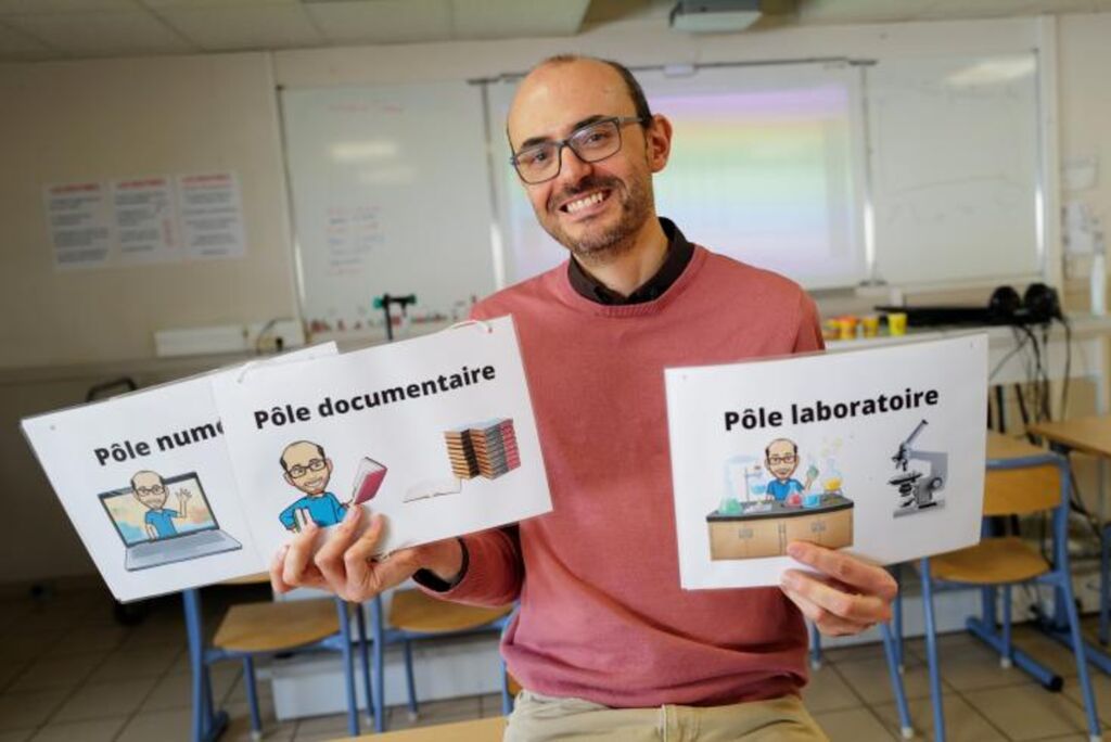 Pour ses cours, il a totalement réaménagé sa classe. Sur l'estrade, "la scène", il délivre la leçon, avec, face à lui, un seul premier rang d'élèves. Puis il circule auprès des autres enfants, répartis dans différents "pôles" de la salle, face aux fenêtres. D'autres élèves sont eux au centre de documentation, pour des recherches sur la leçon du jour, "le système nerveux", également disponible en version audio, en ligne, racontée par une voix de synthèse.