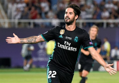 | Le milieu du Real, Madrid Isco, exulte après avoir inscrit le second but pour le Real Madrid face à Manchester United lors de la Supercoupe d'Europe, le 8 août à Skopje. |