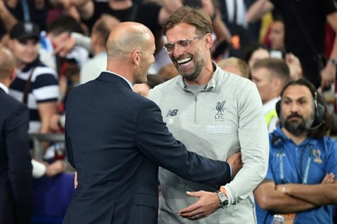 | Les entraîneurs du Real, Zinédine Zidane (gauche) et de Liverpool, Jürgen Klopp, avant la finale de la Ligue des champions à Kiev. |