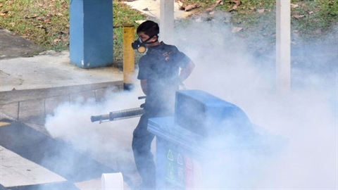 | Vaporisation d'une zone à Singapour le 5 avril 2016 pour tuer les moustiques éventuellement transmetteurs du virus Zika. |