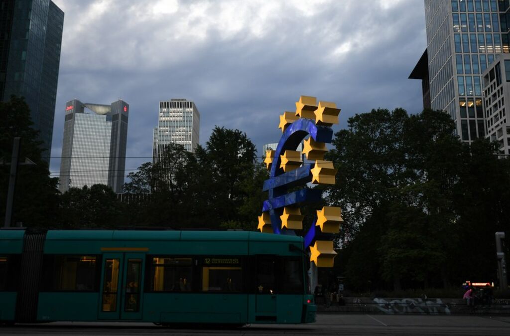 | Photo prise le 1er juin 2022 montrant la sculpture géante de l'euro dans la ville de Francfort, en Allemagne. |