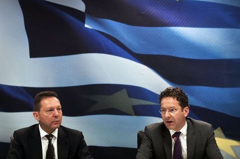 | Le ministre grec des Finances Yiannis Stournaras (gauche) et le président de l'Eurogroupe, Jeroen Dijsselbloem, le 31 mai à Athènes |