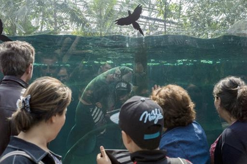 | Des visiteurs observent un lamantin nager le 12 avril au zoo de Vincennes, à Paris. |