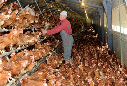 | Un éleveur de Castelmoron-sur-Lot (Lot-et-Garonne) inspecte son élevage de poules pondeuses au label "Plein air", le 27 novembre 2008 dans le hangar qui leur sert d'abri. |