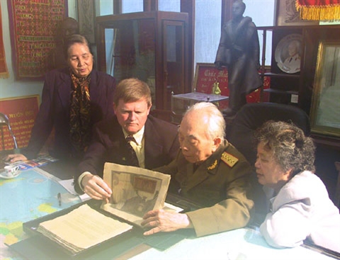 | David Thomas (2e à gauche) présente son recueil de portraits du Président Hô Chi Minh au général Vo Nguyên Giap (2e à droite). |