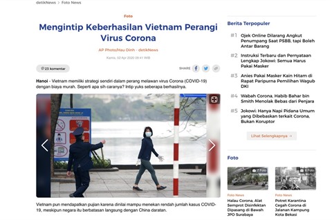 Le journal detik.com a publié un reportage photos de l'AP "Prédire le succès du Vietnam dans la lutte contre le corona" avec des photos de Hanoï après l'ordre de mettre en œuvre l'isolement social. L'article a souligné que le Vietnam a sa propre stratégie dans la lutte contre le COVID-19 avec un faible coût et un succès élevé, et est salué par le monde. Pendant ce temps, la Radio Nationale d'Indonésie (RRI) a également rapporté que le Vietnam n'avait pas eu de décès dû à l’épidémie.