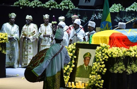 | Les responsables religieux rendent hommage au chef d'état-major de l'armée, Seare Mekonnen, lors d'une cérémonie à Addis Abeba, le 25 juin. |