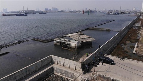 | La digue maritime géante à Jakarta empêchant l'eau de mer de pénétrer dans les terres et de causer des inondations. |