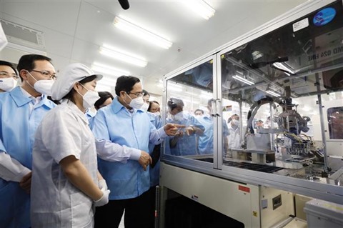 | Le Premier ministre Pham Minh Chinh (droite) en visite de l'usine de Samsung Vietnam à Thai Nguyên (Nord). |